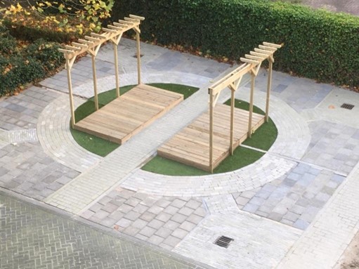 Bij Bouwen, Wonen en Interieur (BWI) hebben we een prachtige tak van boven- en ondergrondse infra. Dit resulteert in onderstaande mooie tuintjes die de leerlingen per kwart in tweetallen maken. Een kwart tuintje wordt door 2 leerlingen gemaakt, zodat er 8 leerlingen aan dit totale project werken. Het probleem is alleen dat als het gaat regenen tijdens het werk de leerlingen niet verder kunnen of als de les voorbij is en ze een prachtig zandbed klaar hebben het werk ’s avonds verregent. Dit is heel demotiverend. Om dit probleem op te lossen wordt over een deel van de buitenruimte een hal geplaatst van circa 11 bij 30 meter. Zo kan bij slechte weersomstandigheden de les gewoon door gaan. En de motivatie wordt vergroot.